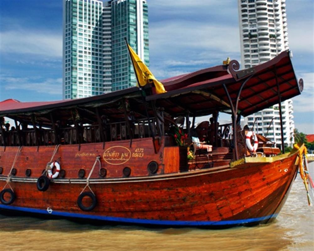 Step aboard a beautifully restored antique rice barge and set sail on the majestic Chao Phraya River at dusk.