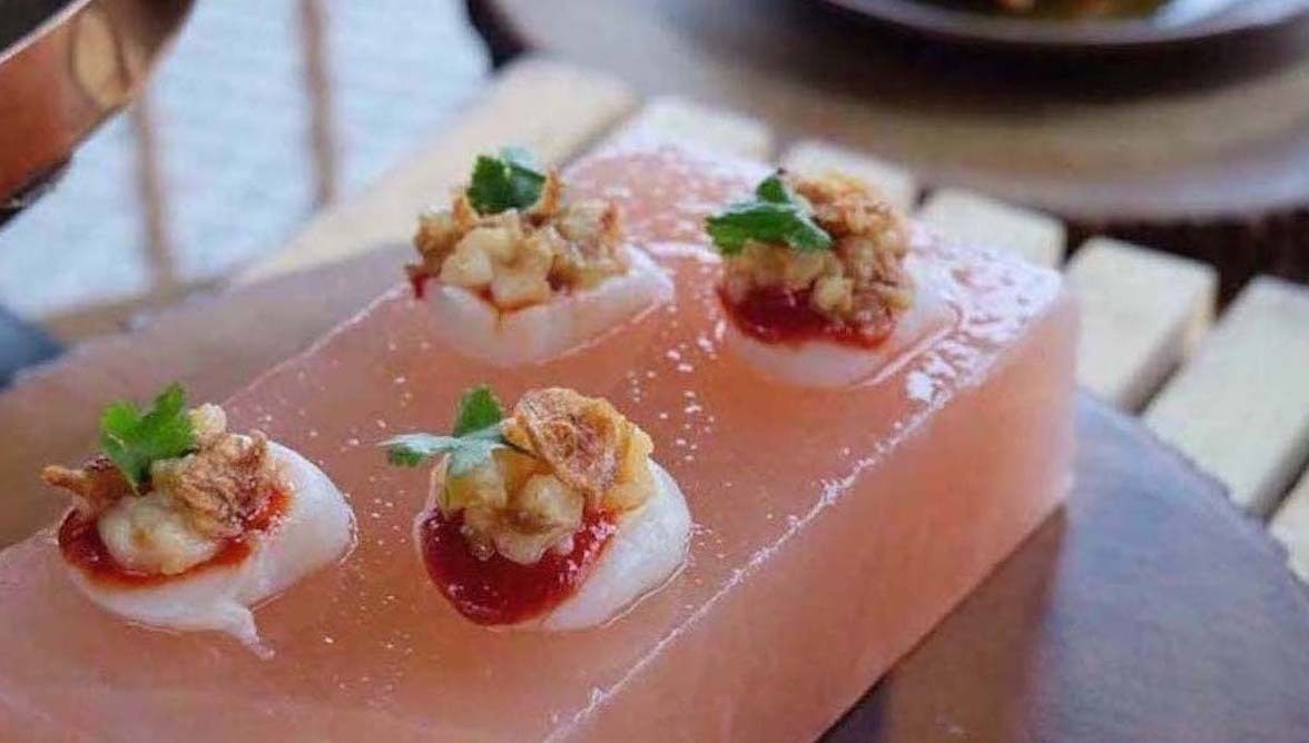 SCALLOPS SASHIMI - Cool Himalayan Salt Block - Minced Shrimps and Peanut with Sweet Dried Chili Sauce